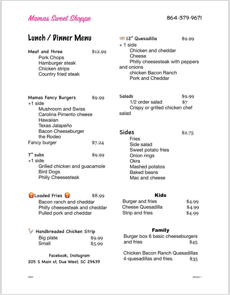 Mama's Sweet Shoppe offers a menu that blends classic bakery treats with comforting café-style fare. The selection focuses on fresh, homemade donuts and pastries alongside simple, satisfying breakfast and lunch options. Whether you’re stopping by for a morning coffee and a sweet bite or a casual midday meal, the menu complements the laid-back, welcoming atmosphere of this small-town spot.